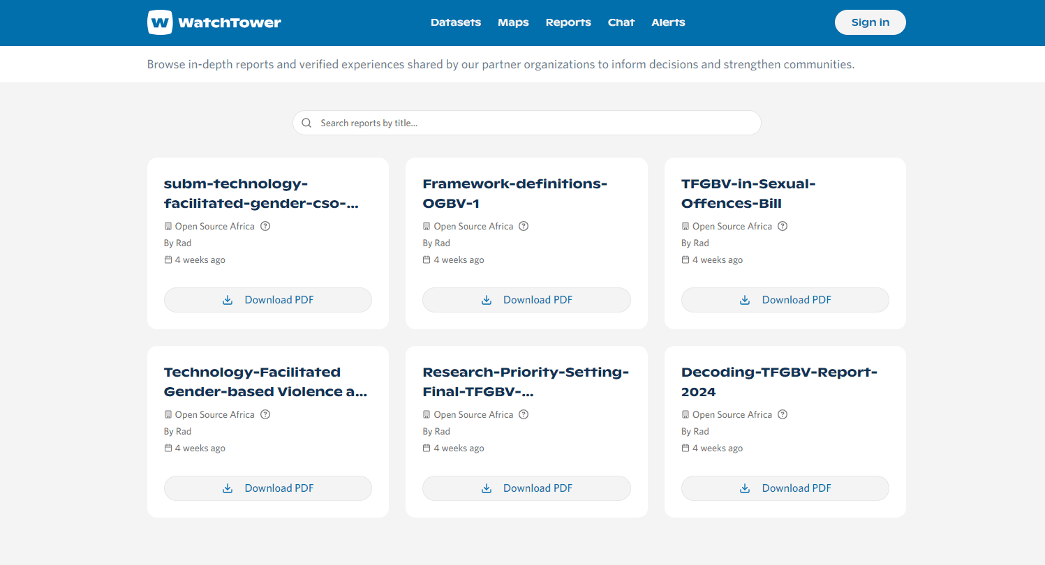 The platform hosts a library of shared by WatchTower's partner organizations. These documents, often available as PDFs, serve to inform decision-making and strengthen communities. Key focus areas include issues like Technology-Facilitated Gender-based Violence (TFGBV).