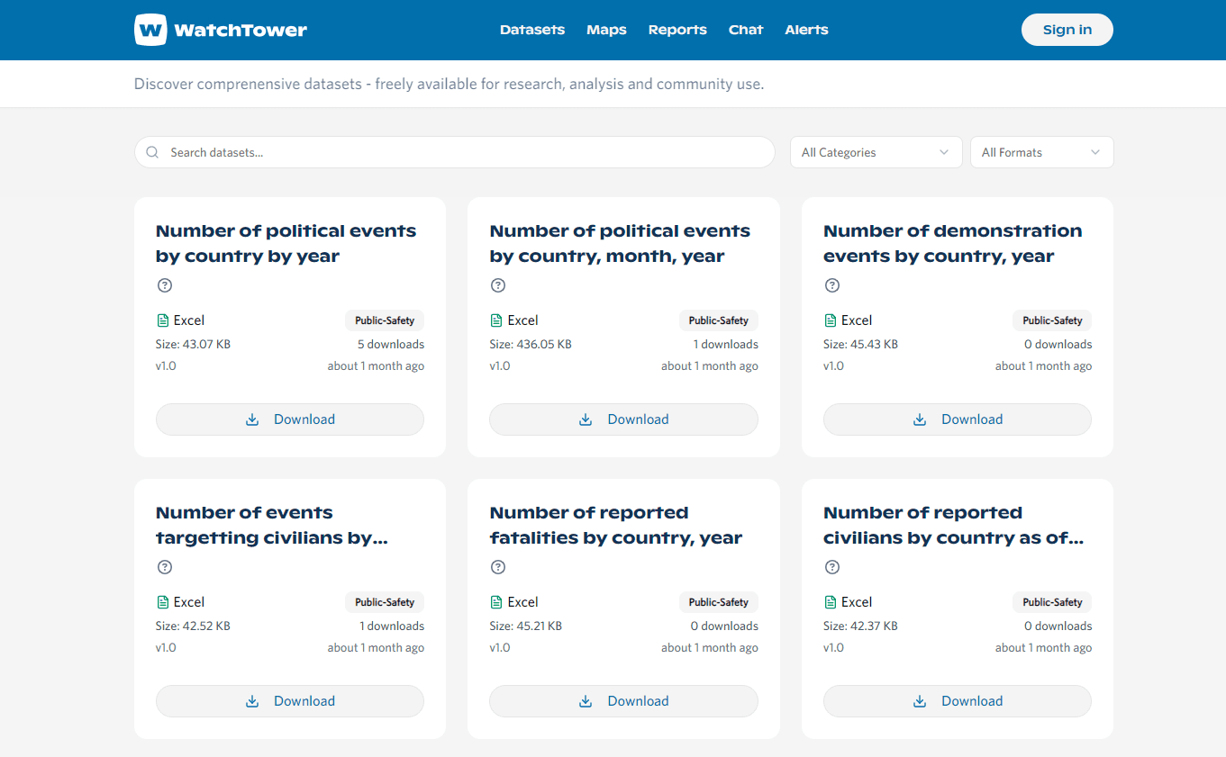 WatchTower democratizes access to comprehensive data. Users can discover and download freely available datasets (in formats like and ) for deep research and analysis. These resources include metrics like: